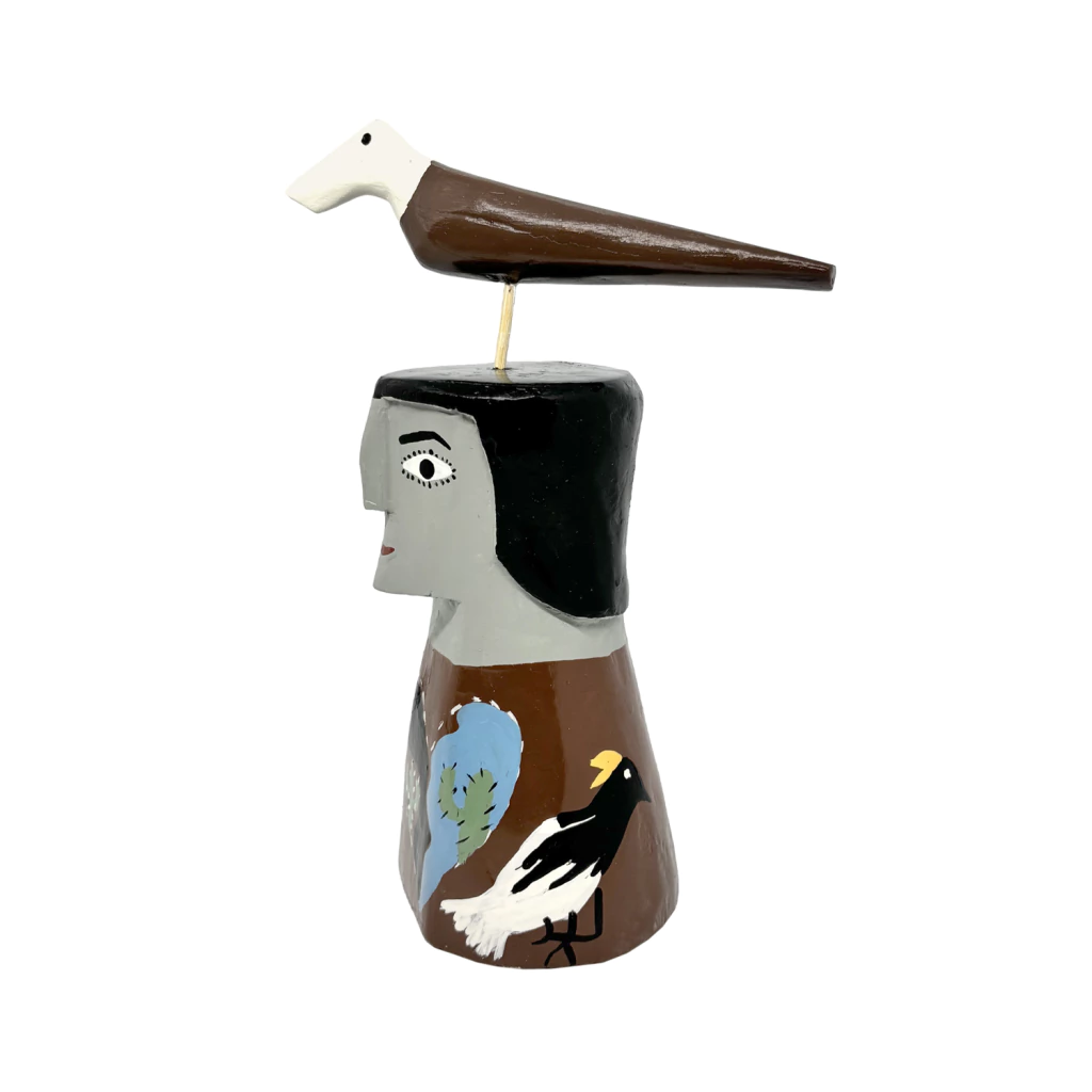 Escultura em madeira entalhada e pintada à mão. O pássaro repousado sobre a cabeça simboliza liberdade, sonho e imaginação. Cada peça é única e se destaca por suas formas e cores vibrantes.